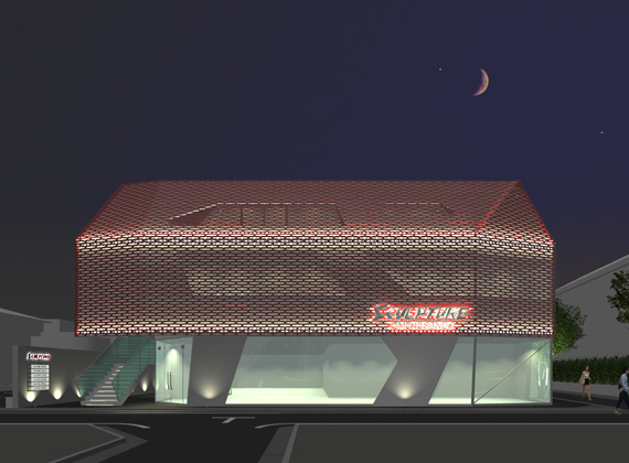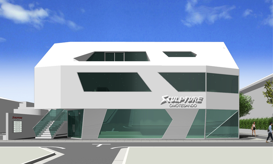 渋谷区神宮前4丁目の299㎡のL字型の小さな敷地に3階建てで計画したテナントビルである。 前面道路や隣地との関係、北側斜線などの制約から上部が変形にならざるをえないが、それを逆にデザインとして彫刻的なフォルムの建築としてまとめた。 小さな建物ながら街の風景に変化と狭い通りを歩く人々にインパクトを与えることのできるデザインである。
